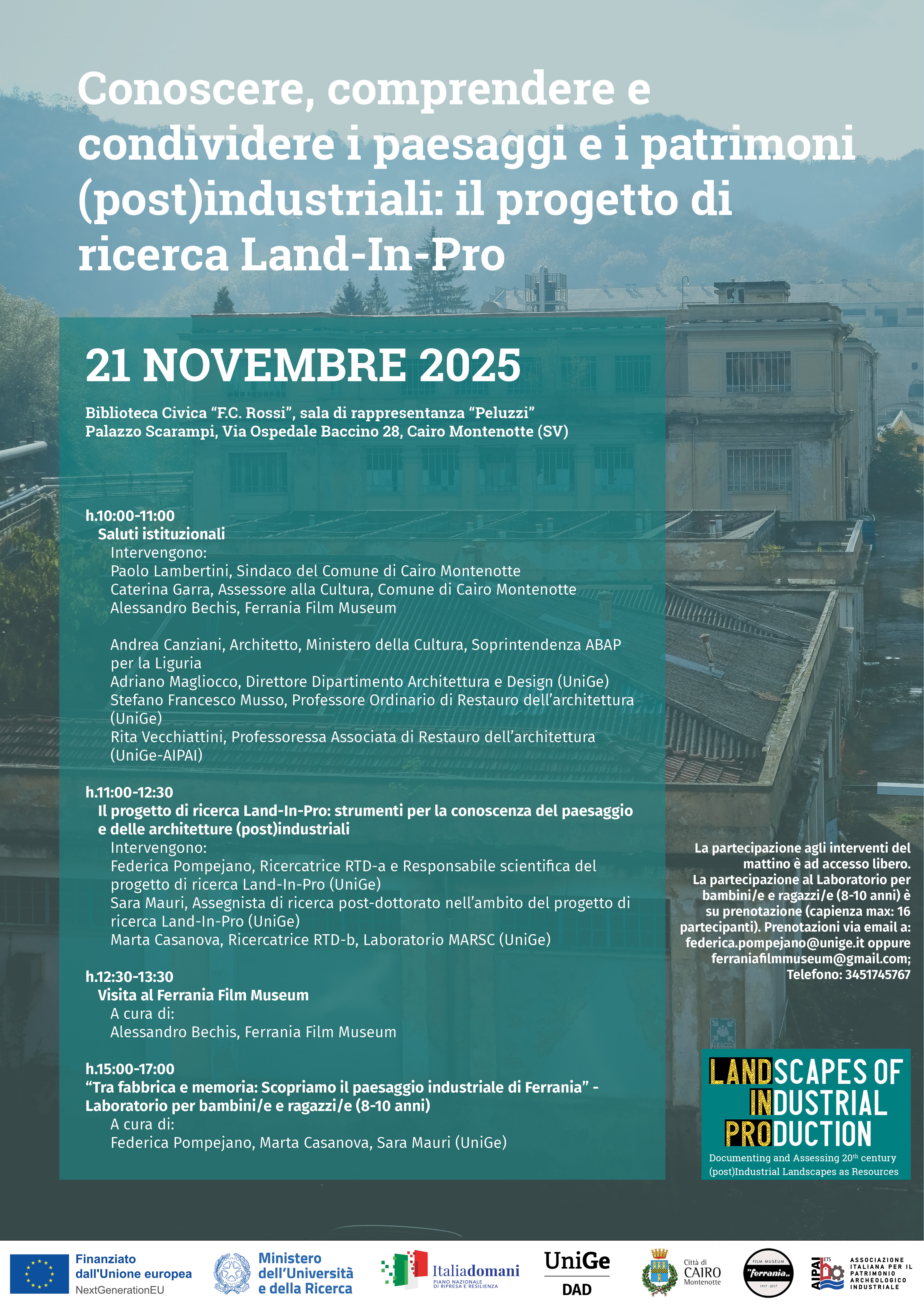 • As part of the Land-In-Pro dissemination activities, on Friday, November 21, 2025, from 10:00 a.m. to 1:30 p.m., Federica Pompejano, Sara Mauri, and Marta Casanova will present the results of the research project "Landscapes of Industrial Production: Documenting and Assessing 20th-Century (Post)Industrial Landscapes as Resources (Land-In-Pro)" during a day dedicated to the (post)industrial landscapes and heritage of the Bormida Valley, organised in collaboration with the Municipality of Cairo Montenotte and the Ferrania Film Museum.